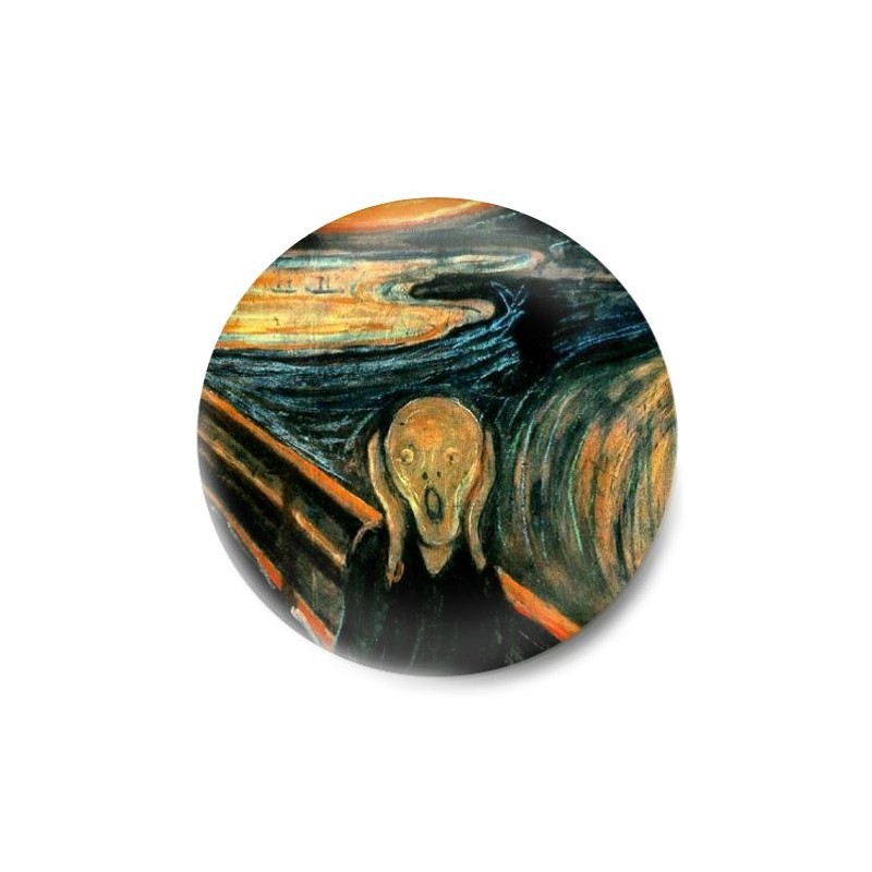 Chapa de 25mm con aguja con el diseño El Grito Munch. También hay otros tamaños y acabados disponibles (imán, abrebotellas, espejo, llavero, etc).